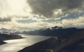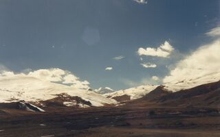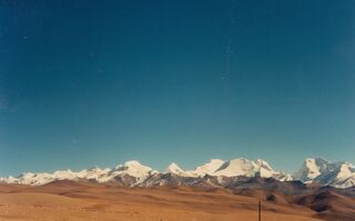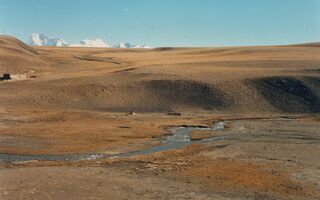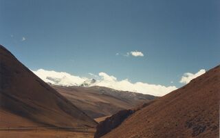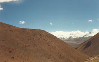 Autobusfahrt von Shigatse über Po La 4 500m, Hi Tshing – warme Mineralquellen, Lhatse, Thatso La 5 250m, Shigar, Tingri, Dobzang La 5 100m, Lahng La 5 135m nach Shangmu, Nach dem Thatso La 5 250 m, vor Shigar, Mt. Everest in der Ferne.