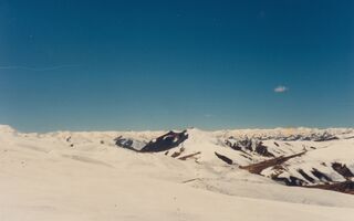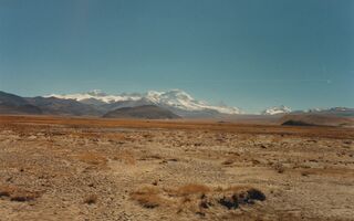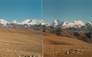 Melungtse 7 181 m, Gauri Shankar 7 145 m?, Langtang – Lirung 7 246m?; Auf dem Nyelan La in km 637 (Nyenang La) (Lalung La) 5 135m, Blick nach Südost. Schönstes Panorama zwischen Shisha Pangma (8 013m) und Mt. Everest (8 840m).