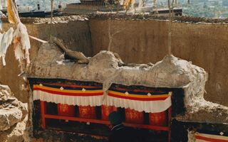Kloster Thashilumpo (der Segensberg), Thangka – Mauer; Pfeil: Leichenzerstückelungsplatz