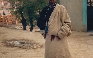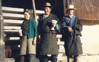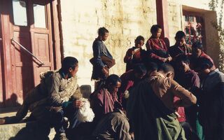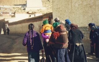 Reisende Tibeter in Baiba vor Lehmziegel Mauer
