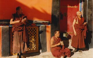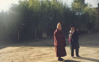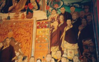 Lamas mit Fotos des Dalai Lama (Tsengresi)