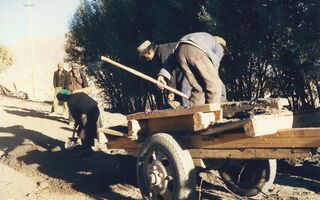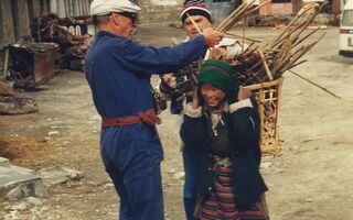 Marcus und Herbert unterhalten sich mit dieser Holzträgerin