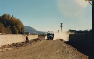 In Lhatse ca. 4 080m Chinesischer Lkw mit Staubwolke