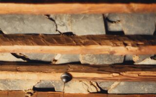 Dachdecke in Rasthaus von Baiba; Holzträme (handgehackt) darauf Schieferplatten darauf Lehmschichten